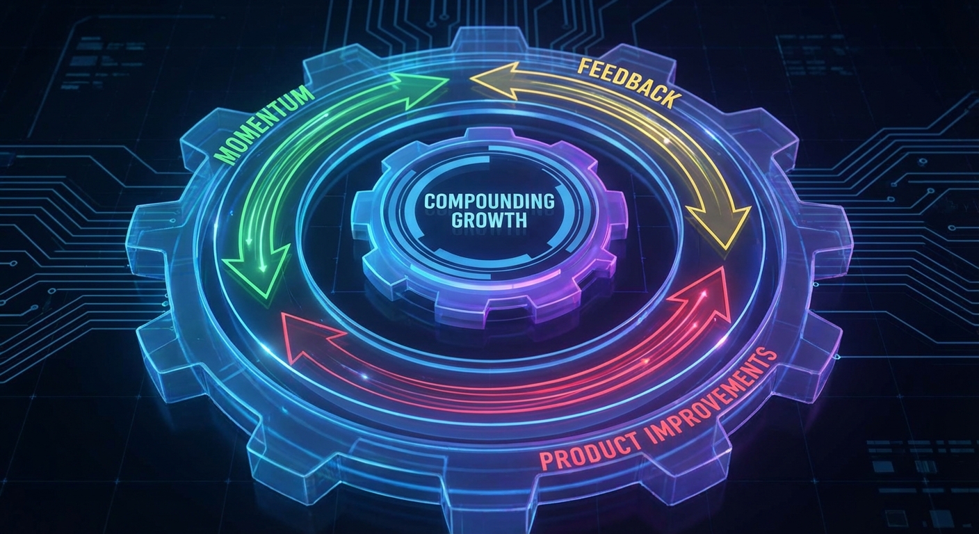 Build a self-reinforcing cycle where feedback improves product, which attracts users, who provide more feedback. The compounding effect that accelerates PMF.